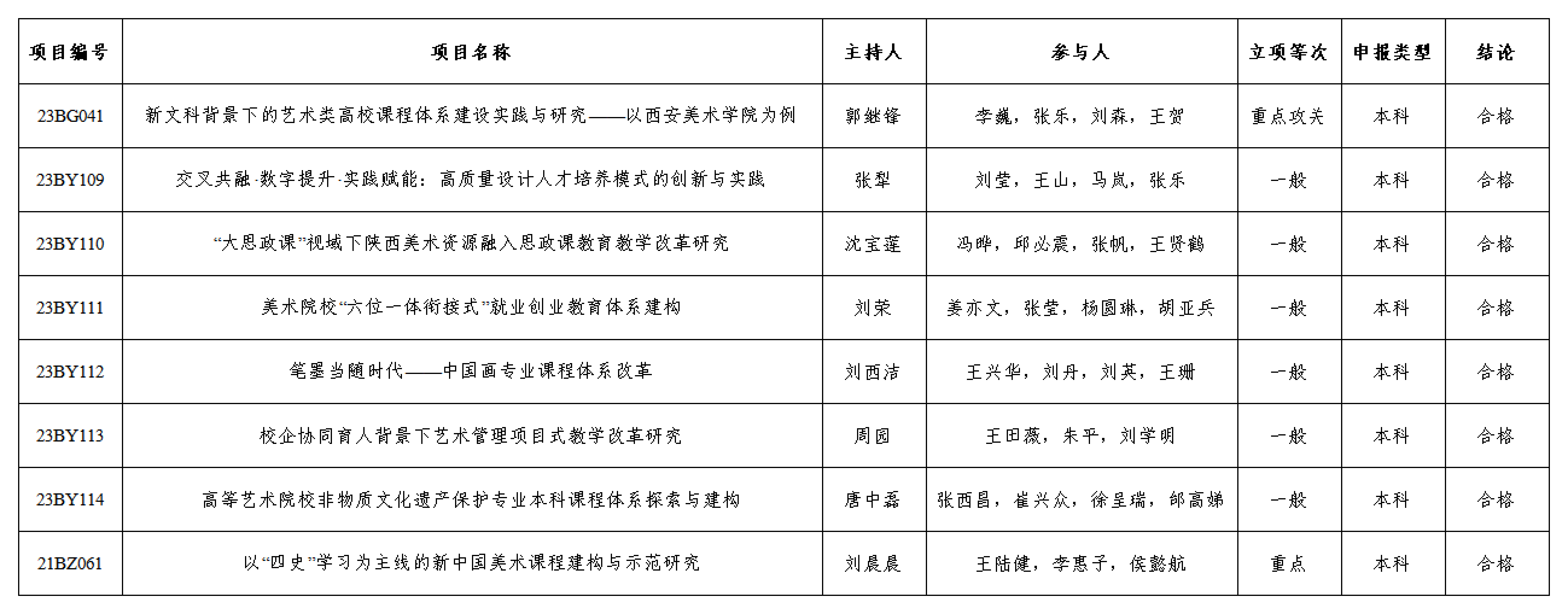近日,陕西省教育厅下发了《关于公布2023年度陕西本科和高等继续教育教学改革研究项目结题验收结果的通知》(陕教高办〔2025〕27号),学院“新文科背景下的艺术类高校课程体系建设实践与研究——以西安美术学院为例”等7个项目通过验收,具体如下: