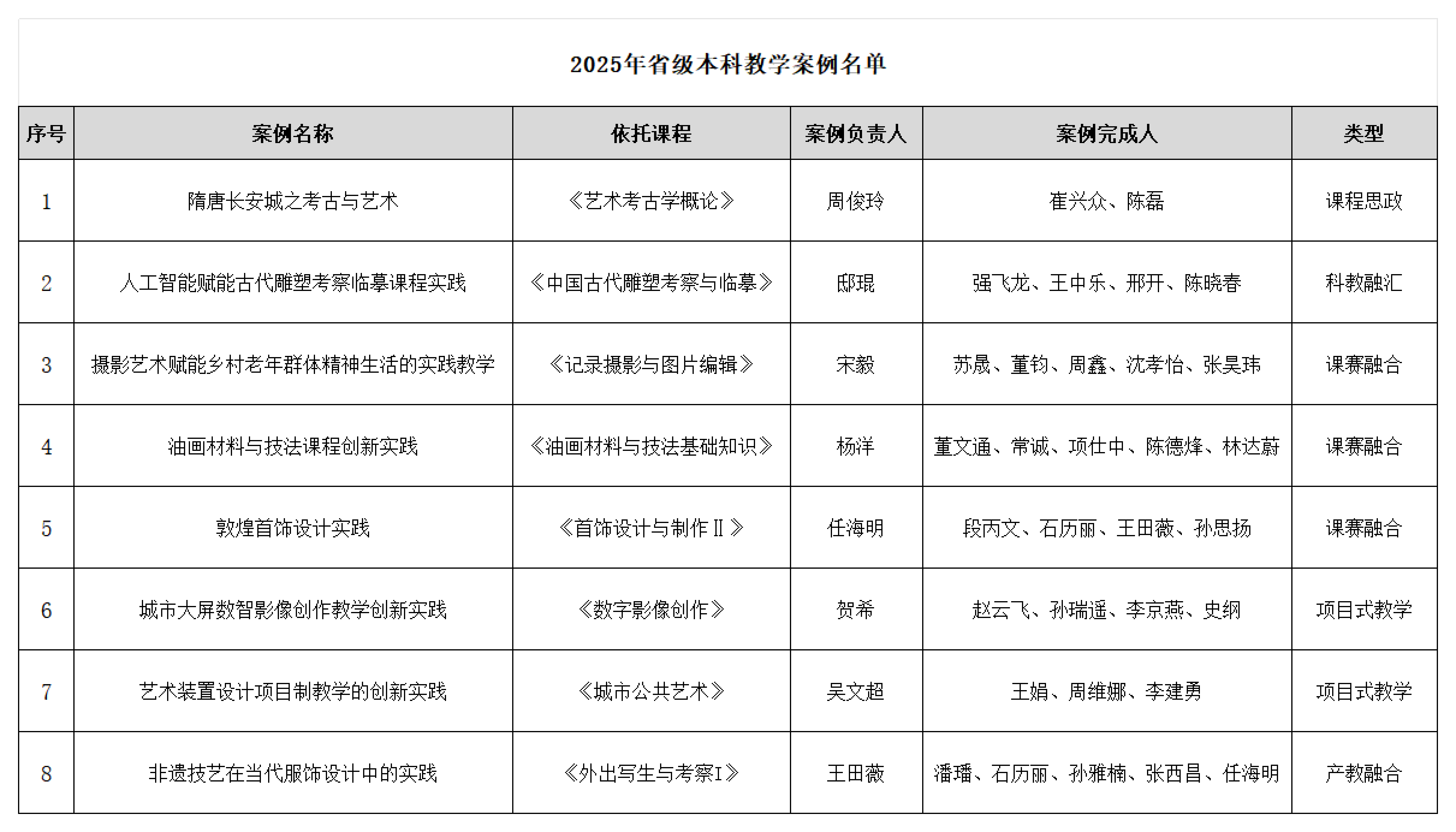 为持续提升本科课堂教学质量,推动教学内容优化更新,系统梳理并凝练西安美术学院在教学实践中的典型经验,充分展示在改革创新过程中形成的具有示范引领作用的做法与成果,根据陕西省教育厅办公室《关于开展2025年本科教学案例征集工作的通知》(陕教高办〔2025〕8号)文件要求,经学院推荐,“隋唐长安城之考古与艺术”等8个教学案例获得省级认定,具体名单如下: