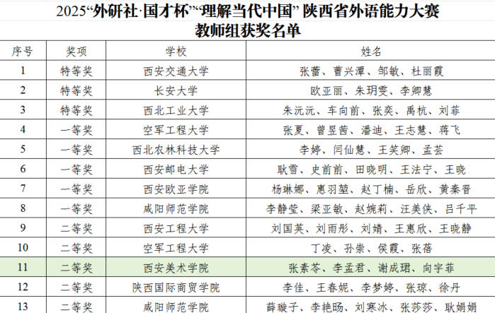 12月3日,陕西省教育厅《关于公布 2025“外研社·国才杯”“理解当代中国”陕西省外语能力大赛获奖名单的通知》正式公布获奖名单。西安美术学院公共基础教学部教师凭借深厚的专业素养和创新的的教学设计,荣获教师组省级二等奖。